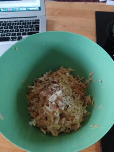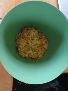 Riv bagekartofler og løget groft. Rør mælkebøtter, æg og krydderier i. Varm en pande med noget god koldpresset olivenolie eller andet godt fedtstof som f.eks. økologisk smør.