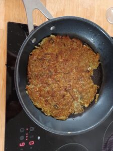 Efter 4-5 minutter når rostien har taget farve tager du en stor tallerken, lægger den på panden og vender rostien i et snuptag. Det er ikke svært. Hæld rostien tilbage på panden og bag den færdig på den anden side. Tag den tid det tager, det smager bedst når rostien er sprød.